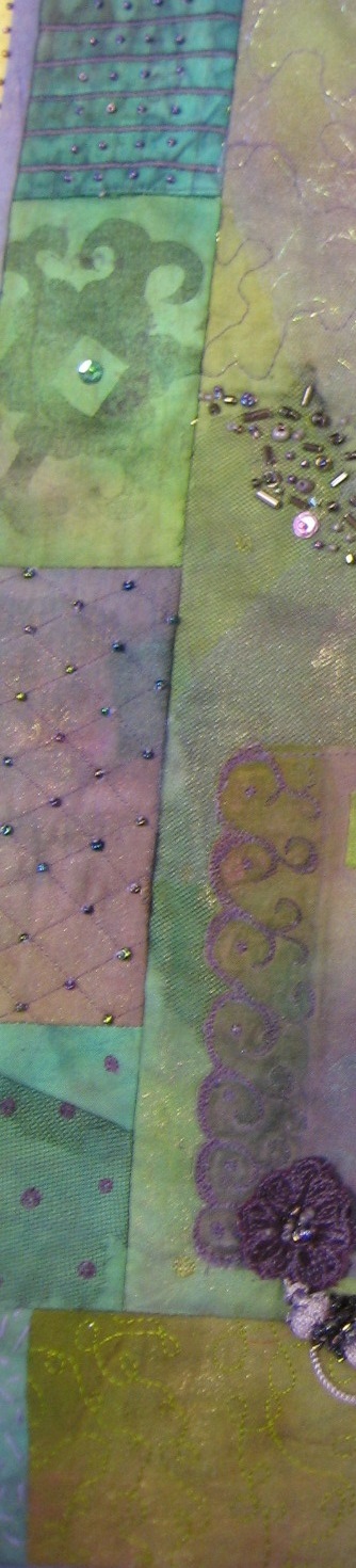 We're always learning and this post holiday season is no exception...it was a tech-ie Christmas for me so I am working on learning new equipment, lighting and the benefits of a photo tent for projects...with the help of' "Fred", my engineer husband who's 'git 'er done' approach to photography has my head spinning. I'm having a flashback to the time when he tried to teach me to golf when we were first married, or skiing just recently or scuba diving a couple years ago...I probably don't need to say much more! I have lots of new pics from my new camera to post here and if you email me, I am happy to share project details and instructions for anything you see on this blog. If you don't own an embroidery machine but would like to make an ARtAngel (all you quilters out there...this would be right up your alley!) I am publishing a pattern of raw edge applique and KreativeKollageTM techniques so you can create along side us! I am also working on kits of my hand-dyed fabrics for you to use for your angel...as you can see, it's a perfect project for your cotton and specialty fabric scraps...making this a very 'green' project. Hopefully you will make several and share them. It's a perfect girls weekend-in project...especially if you live in upstate New York!